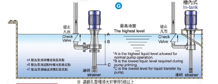 9、出口配管高度如有高过马达以上或有逆压之情形时,请在泵浦出口处装置逆止阀,装置位置请勿超过最高液面线太多。