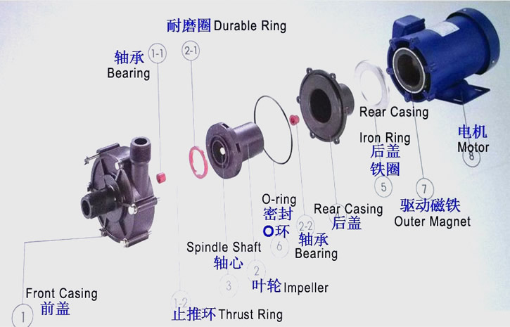 磁力驱动无轴封泵浦是离心泵类设备中的一种,由泵头、磁力传动器、电动机三部分组成。当电动机带动外磁转子旋转时,磁场能穿透空气隙和非磁性物质,带动与叶轮相连的内磁转子作同步